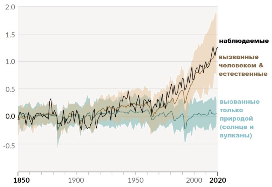 Изменение глобальной среднегодовой температуры под факторами влияния человека и природы (1850 – 2020):