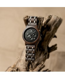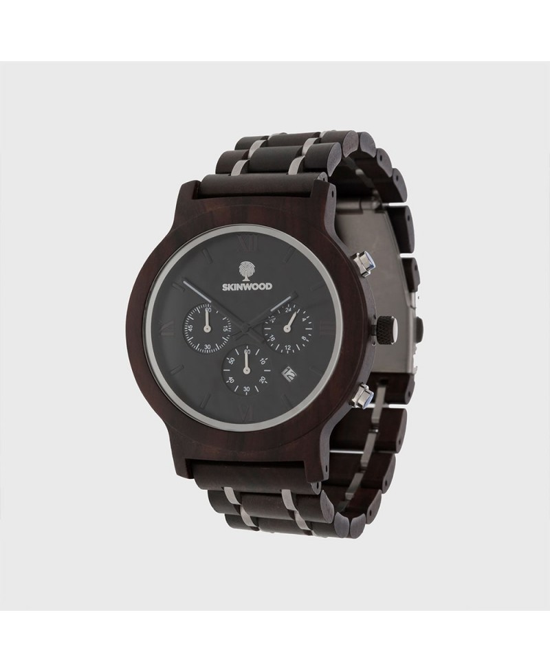 Хронограф Skyline не только показывает время, но и показывает дату, день недели и время суток (день-ночь), что делает его идеальным спутником в путешествиях. Инновационный ремешок сочетает экологически чистую древесину со стильными звеньями из нержавеющей стали, обеспечивая комфорт и долговечность.