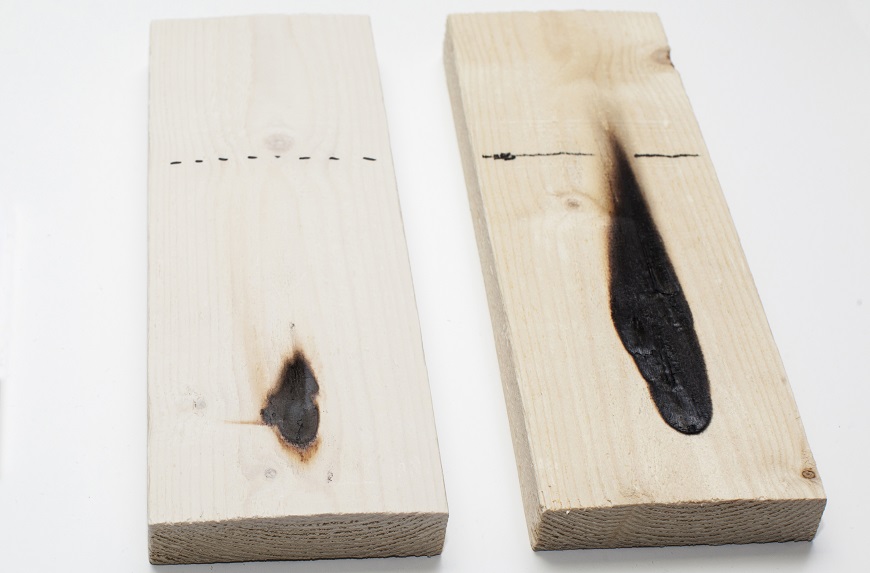 Дерево з покриттям HefCel (ліворуч) і необроблене дерево (праворуч) після 30-секундного випробування полум'ям. (Фото VTT)