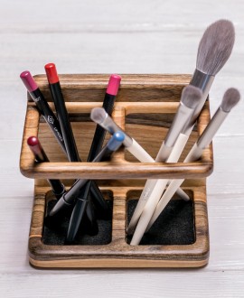 Дерев’яна підставка, що поміщає безліч косметичних засобів та купу дрібниць, важливих для створення ідеального макіяжу.