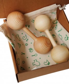 Три брязкальця із колекції "Звуки лісу", виготовлені з натуральної деревини дуба та клена. Гарантія повної екологічності та якості іграшки для немовлят.