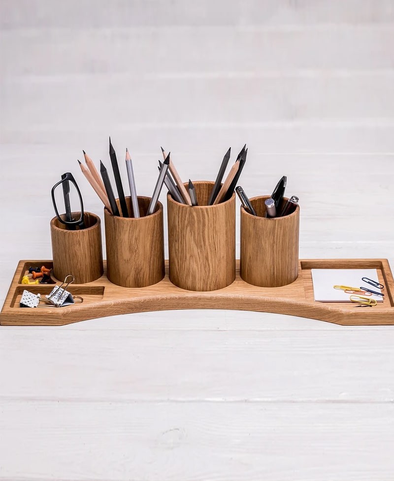 Дерев'яний настільний органайзер стане незамінним аксесуаром на вашому столі. Він підходить як для зберігання канцелярії, так і пензликів для макіяжу. Чотири з'ємні склянки, ретельно відшліфовані вручну, надійно фіксуються в основі, забезпечуючи безпечне транспортування та легке складання.