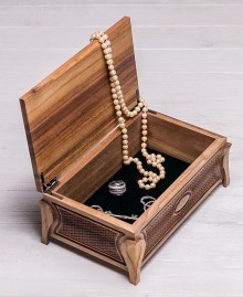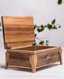 Скринька прикрашена дрібним різьбленням і має спеціальні зони для персонального гравірування: тексту, логотипу чи навіть чорно-білої фотографії. Натуральна деревина, покрита екологічною олією, забезпечує міцність і довговічність.