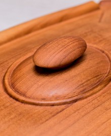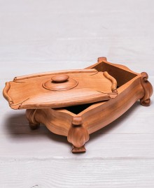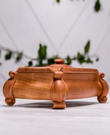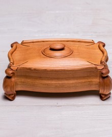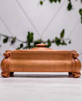 Елегантна різьблена скринька з деревини черешні на фігурних ніжках – ідеальний аксесуар для зберігання особистих речей. Завдяки унікальній конструкції кришка відкривається вгору та відсувається убік, створюючи витончений і практичний дизайн. Скринька прикрашена різьбленням і може бути персоналізована гравіюванням: ініціалів, логотипу чи навіть чорно-білої фотографії.
