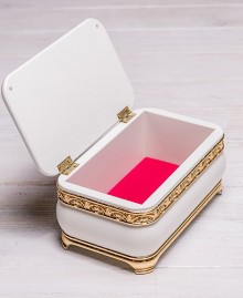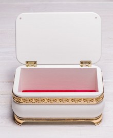 Елегантна скринька з деревини вільхи, пофарбована в білий колір із позолотою (імітація сусального золота), стане стильним доповненням жіночого будуара. Позолочені деталі покриті лаком для практичності, а внутрішня частина основи оброблена преміальним оксамитом.