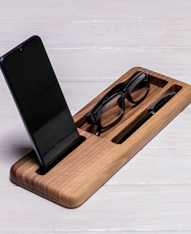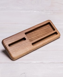 Дана підставка за своєю суттю не має абсолютно нічого зайвого, займає мало місця на робочій поверхні і при цьому розміщує на собі все найнеобхідніше, що у вас є. Тут ви сміливо можете ставити в лівій частині ваш гаджет, а в правому вузькому пазу - ручку або інший, більш широкий гаджет. А осередок за виразом для ручки може зайняти будь-яка дрібниця з вашого робочого столу - тут вона точно не загубиться! Годинники, флешки, ключі, монетки, скріпки або просто окуляри - все буде виглядати дуже стильно.