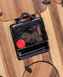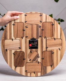 Дерев'яний годинник, виготовлений з ламелей деревини волоського горіха, має безшумний механізм, стильні червоні і чорні стрілки, а також можливість додавати улюблені фотографії.