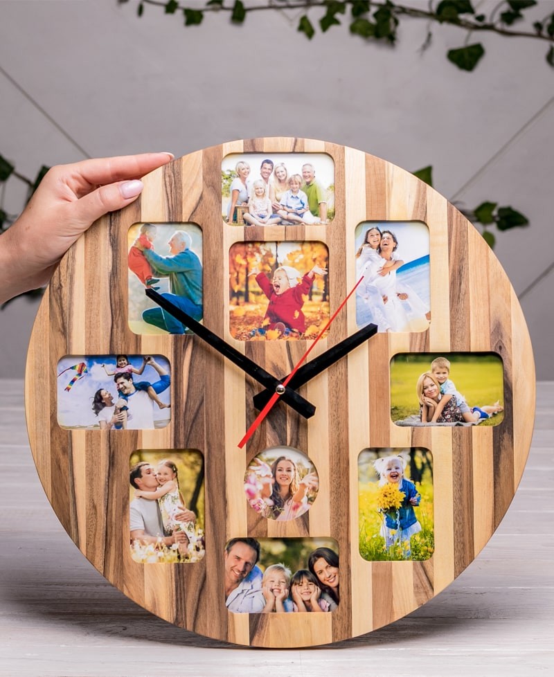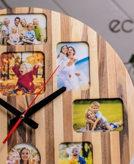 Для того, щоб вставити фотографії в годинник, необхідно на тильній стороні виробу повернути пластикові кріплення, вийняти дерев'яні заглушки і вставити фотографії під скло; потім повернути на місце дерев'яні заглушки, як би притиснувши фотографії до скла, і придавити їх пластиковими кріпленнями на шурупах, повернувши у вихідне положення. Цей процес є максимально простим - він займає не більше 10 хвилин.