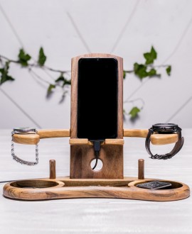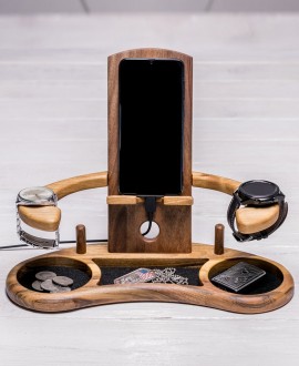 Ми представляємо Вам універсальний настільний органайзер з дерева для смартфона, годинника, браслетів, біжутерії та інших дрібниць, яким можна знайти місце на цьому аксесуарі. Ми постаралися розробити такий форм-фактор вироби, щоб ним могло користуватися якомога більше людей. Продумана конструкція в союзі з високою якістю виконання робіт, а також практичність в застосуванні і повсякденна зручність зроблять роботу з цим органайзером для Вас незабутньою.