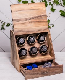 Якісна робота майстрів столярної справи в поєднанні з деревиною волоського горіха, ідеально пошиті подушечки для наручних годинників і продуманий функціонал, надають цьому виробу неймовірного шарму і практичності - спереду ви кладете годинник, знизу - невеликий ящик для будь-яких особистих речей, а ззаду - таємне місце на магнітних засувах.