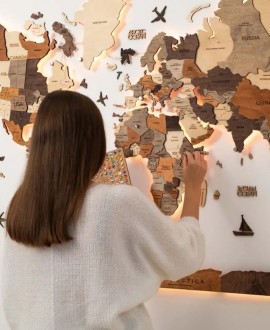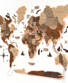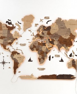 Це настінне багатошарове панно у вигляді мапи світу поєднує натуральну деревину, гравіювання та сучасні технології. Головна особливість – активне LED-підсвічування, яке може реагувати на навколишній звук, голос чи музику, а також змінювати кольори відповідно до зображення з камери смартфона. Такий режим створює ефект "живого" інтер'єру та додає динаміки простору.
