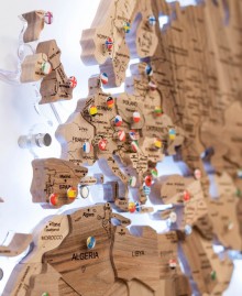 Мапа може виконувати роль персонального тревел-борду: на ній зручно відзначати відвідані країни, планувати нові маршрути або просто надихатися ідеями для подорожей. Натуральна деревина приємна на дотик і добре передає текстуру матеріалу, що робить кожен виріб унікальним.