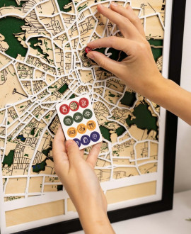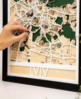 Кожен елемент виробу ретельно шліфується вручну та покривається екологічним масловоском, що надійно захищає дерево та підкреслює його природну красу. Дизайн карти виконаний у стриманому мінімалістичному стилі, де тепла палітра дерева гармонійно контрастує з точними лініями міської забудови. Ви отримуєте повністю готовий до монтажу виріб, який додасть затишку та інтелектуального стилю вашій вітальні, кабінету чи офісному простору.