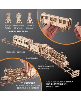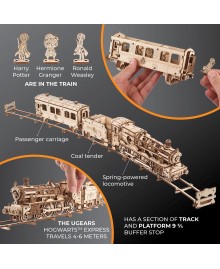 Заведіть модель за допомогою спеціального ключа, покрутіть перемикач «Пуск/Стоп» у вигляді димової труби, а потім спостерігайте за злагодженим рухом шестерень і коліс локомотива, коли він мчить уперед. Гоґвортс™ Експрес здатен проїхати 4 метри (з тендером і вагоном) або 6 метрів (лише локомотив) на будь-якій гладкій рівній поверхні. 3D-конструктор також має у комплекті залізничну колію. Ви можете встановити потяг на колію, щоб демонструвати цей витвір мистецтва, складений власними руками, друзям та близьким.