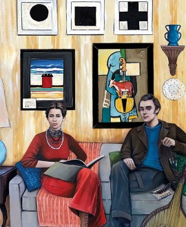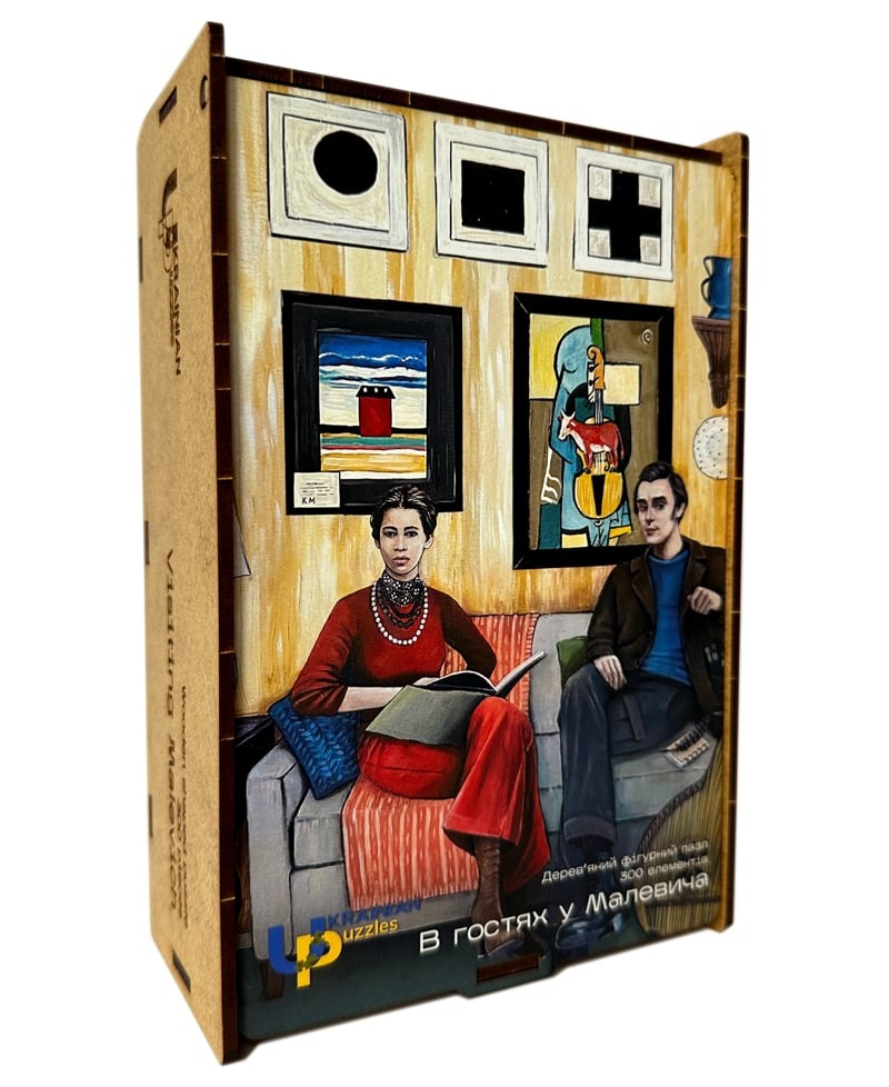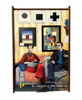 Дерев'яний фігурний пазл «В гостях у Малевича» - це новий, сучасний пазл з серії «Українське мистецтво». На ньому зображено фантастичний візит Тараса Шевченка та Лесі Українки до відомого українського художника-авангардиста Казимира Малевича у його київському домі.