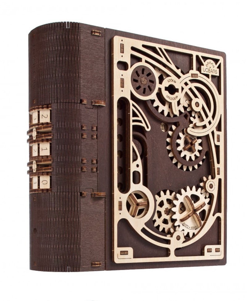 Зберігайте свої секрети у стильній Книзі Секретів! Цей дерев'яний 3D-конструктор у стімпанк стилі – це скринька у вигляді книги з тризначним кодом та захопливою механікою відкриття. Усередині знаходиться просторий відсік для особистих речей. Щоб відкрити книгу, введіть комбінацію, витягніть ключ і запустіть механізм.