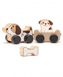 Цей набір включає дві основи на колесах, фігурку милого цуценятка та кісточку. Одну з основ оснащено дерев'яним штирем, на який можна встановлювати фігурку цуценяти чи кісточку, додаючи варіативності до гри. Завдяки вмонтованим магнітам елементи надійно тримаються разом, забезпечуючи зручність і безпеку під час гри.