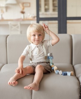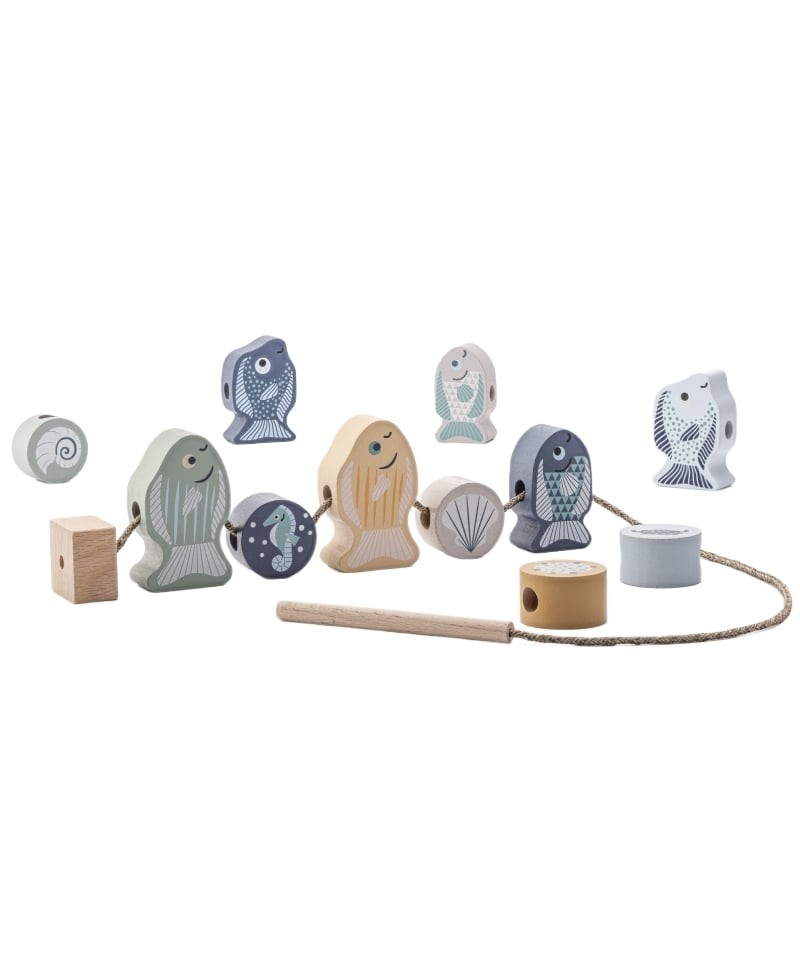 У комплекті 12 різнокольорових фігурок рибок та морських мешканців, а також міцний шнурок з дерев’яним наконечником, що робить нанизування легким та цікавим. Додаткова картка із зразками допоможе створювати різні комбінації та завдання для дитини.