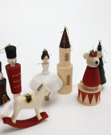 Розміри іграшок: Балерина (5*5*8 см), Лускунчик (2*2*8 см), Червоний солдатик (2*2*9,5 см), Зелений солдатик (2*2*10 см), Мишка (2,5*2,5*5 см), Ялинка (3*3*8 см), Коник (6*5,5*1 см), Барабан (3,5*3,5*2 см), Вежа (2,5*2,5*10 см)