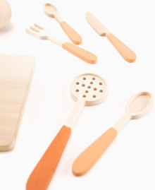 Прибори виготовлені з масиву твердих порід дерева, ретельно відшліфовані до шовковистості та покриті безпечним еко-складом, що зберігає природний малюнок деревини. Це іграшка, яку приємно тримати в руках і яка служитиме поколінням, не втрачаючи своєї актуальності.