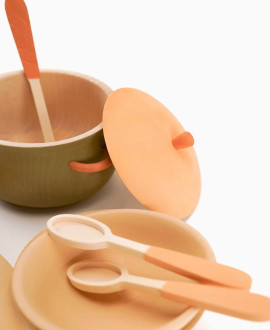 Продумані габарити предметів дозволяють малюкові легко опанувати кулінарну справу: велика каструля (12 x 12 x 10 см) та пательня (12 х 12 х 4,5 см) мають зручні кришки для «збереження тепла» страв. Сервірування столу стає справжнім уроком естетики з використанням глибоких тарілок (10,5 х 10,5 х 3 см) та делікатних пласких тарілок (11,5 х 11,5 х 1,5 см).
