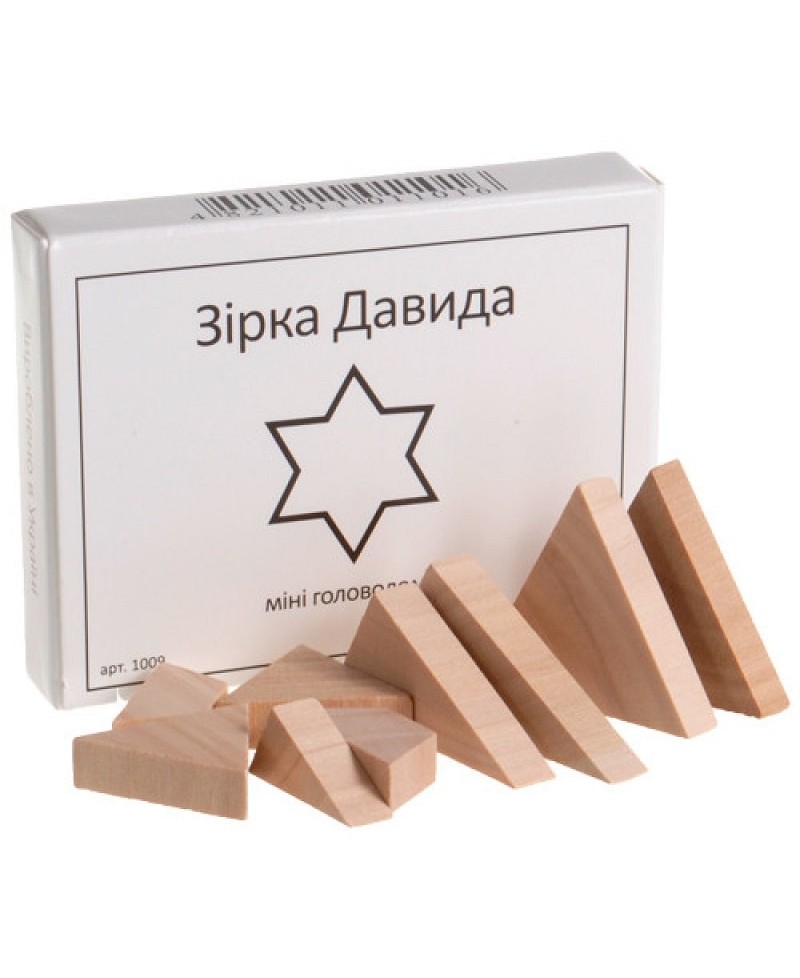 Завдання: Зібрати зірку з 9 частин. Матеріал: дерево. Упаковка: картон з додатковим завданням. Розмір: сірникову коробку. Якщо вийде зібрати швидко - чисте везіння. Рекомендуємо брати перерви :)
