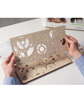 Макет зроблений з якісної фанерної дошки, яка приємно пахне справжньою деревиною. На збирання цього 3D пазлу вам необхідно приблизно 4 години. Вам не знадобиться клей та інші прибори, все необхідне є у наборі від виробника. У вас є змога зібрати власний рухомий глобус з точним відтворенням земної поверхні. Для додаткової декорації виробники включили в глобус супутник та шатл.