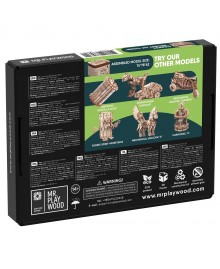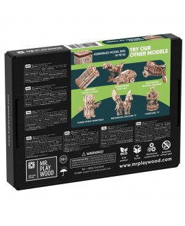 Конструктор збирається з 94 високоякісних, вирізаних лазером дерев'яних деталей, які необхідно від'єднати від планшетів і зібрати без клею за інструкцією.