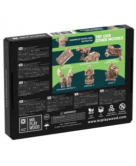 Конструктор збирається з 100 високоякісних, вирізаних лазером дерев'яних деталей, які необхідно від'єднати від планшетів і зібрати без клею за інструкцією.