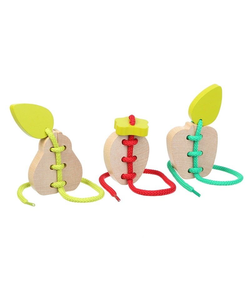 Цікава дерев'яна іграшка у вигляді яблук, для того, щоб іх скласти, необхідно одягнути на шнурівку дві дерев'яні частини.