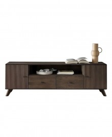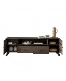 Тумба має кілька секцій: закриті відсіки для техніки чи кабелів, відкриті полиці для медіа-девайсів, а також шухляди для аксесуарів – усе це організовано з увагою до деталей.