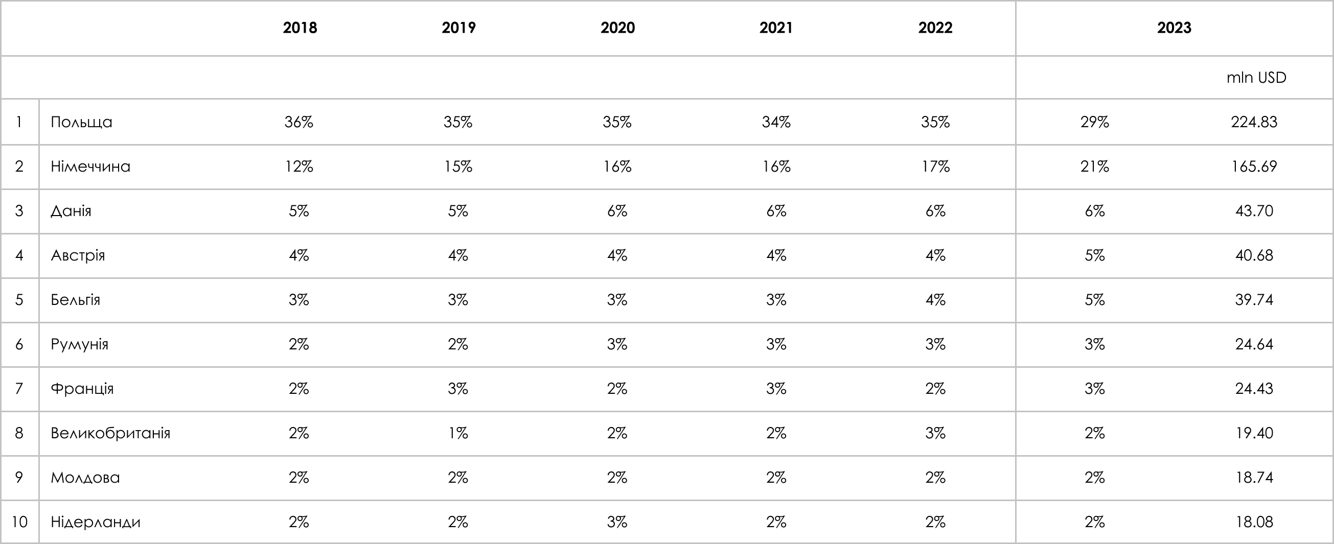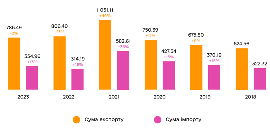 – Експорт дерев'яних меблів: за останні п'ять років обсяги експорту дерев'яних меблів зросли на 40%, досягнувши 1 051,11 млн доларів США у 2021 році. Однак у 2023 році ці обсяги знизилися до 786,49 млн доларів США, що на 2% менше порівняно з попереднім роком.