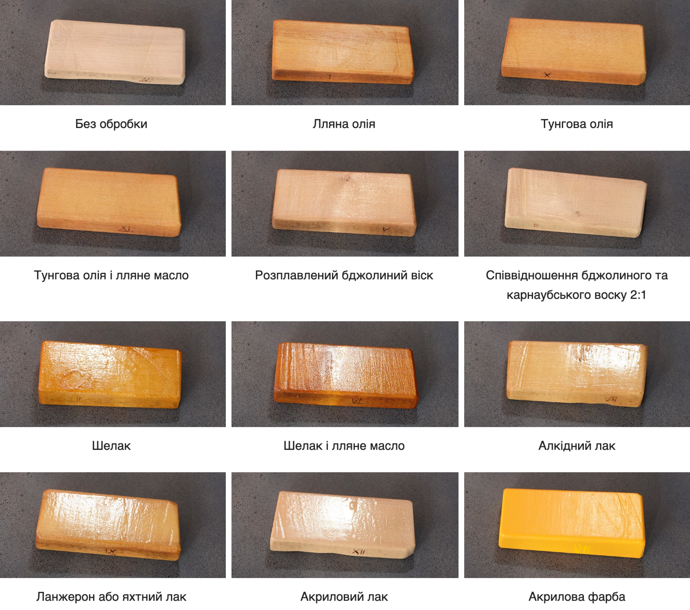 – Вигляд: рідка, інколи трохи густа текстура, яка легко вбирається в деревину. Після висихання поверхня залишається матовою або з легким блиском, із природним відчуттям гладкості.