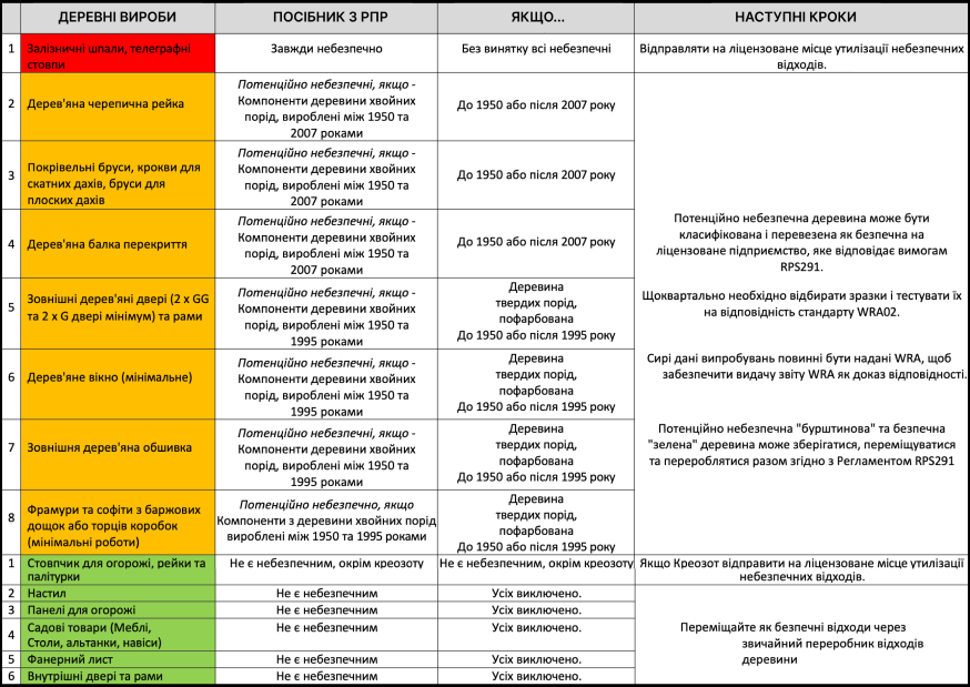 Крім того, визначено категорію ВЖД–ПХБ, яка охоплює деревину, що містить поліхлоровані біфеніли (ПХБ) та інші шкідливі сполуки, які потребують спеціальної обробки. Така класифікація допомагає регулювати поводження з відходами деревини та забезпечує стале та безпечне використання цього цінного ресурсу.
