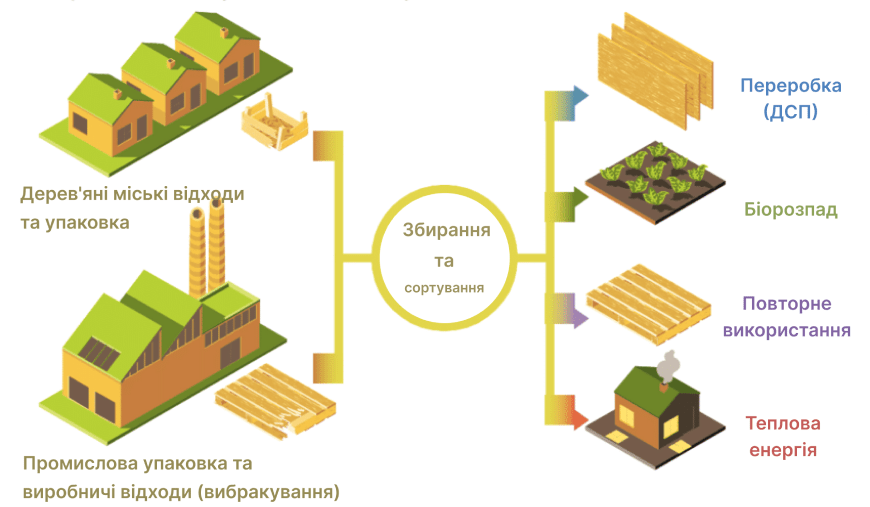 Обробка та утилізація цих відходів стають важливою складовою стратегії сталого управління природними ресурсами і охорони навколишнього середовища. Вживана деревина (ВЖД), утворюючись з бракованої продукції та відпрацьованих виробів, є ключовим джерелом біомаси. Її ефективне використання сприяє зменшенню викидів CO2, роблячи це одним із важливих кроків у використанні ресурсів.