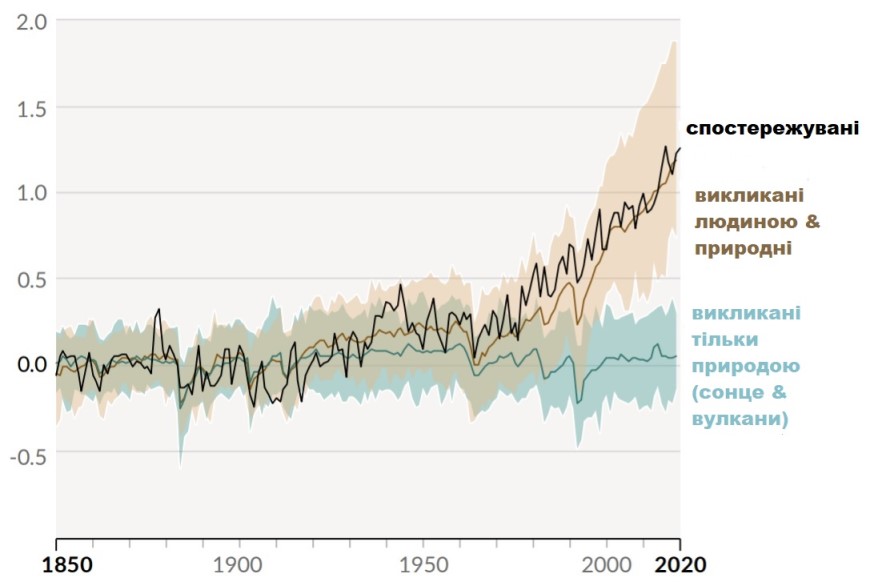 Зміна глобальної середньорічної температури під факторами впливу людини і природи (1850 – 2020):