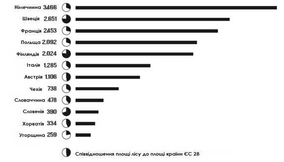 Щороку у Європі вирощується 776 мільйонів кубометрів деревини. Заготовляється лише 490 мільйонів кубометрів, цим збільшується загальна площа лісів Європи на 286 мільйонів кубометрів на рік [1].