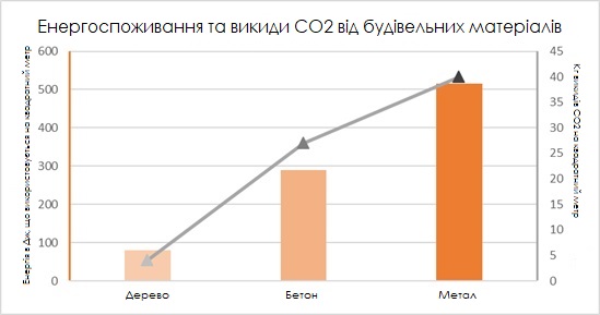 Дерево залишає в цілому менший екологічний слід, ніж сталь або бетон, для виробництва яких потрібно в 3-4 рази більше води і майже в 2 рази більше викопного палива.