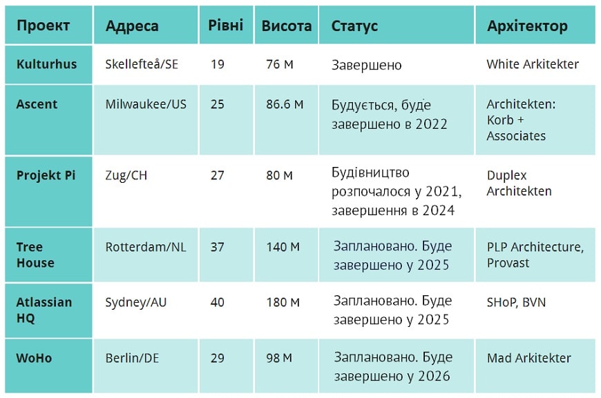 Тим не менш, ми можемо продовжувати мріяти про велике. І саме тому ми хочемо показати вам найвражаючі дерев'яні будівлі сьогодення та майбутнього. Sara Kulturhus – найвища дерев'яна будівля у Швеції, була завершена у 2021 році. Звідти наша подорож приведе вас до Роттердама, де планується звести 140-метровий Будинок з дерева. А 2026 року до Woho у Берліні, 98-метровий гігант на 29 поверхів, що збирається височіти над мегаполісом.